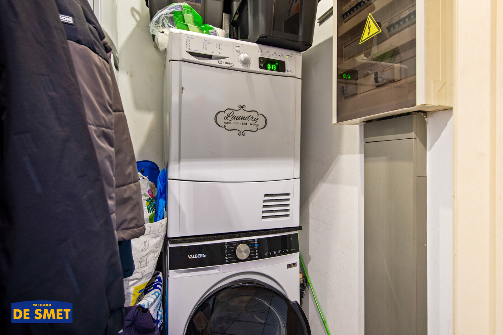 We betreden het appartement via de inkomhal, die toegang biedt tot een praktische berging en een apart toilet.