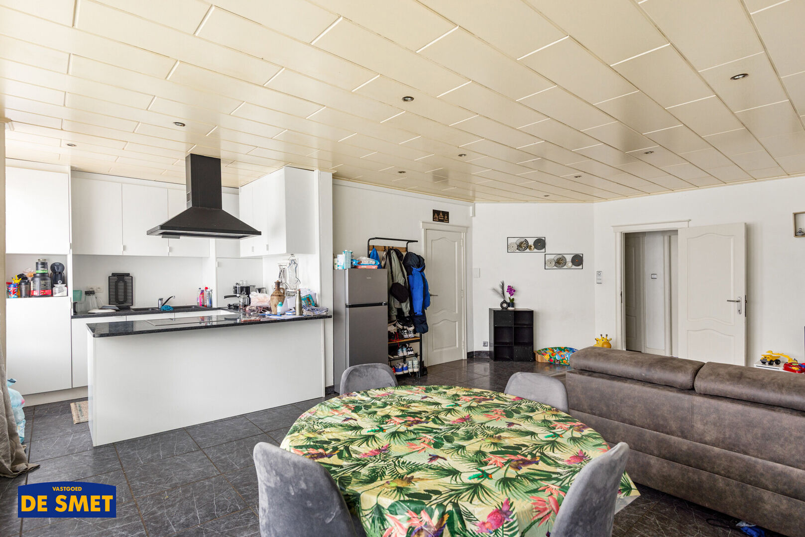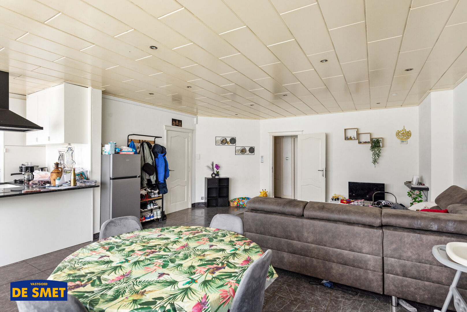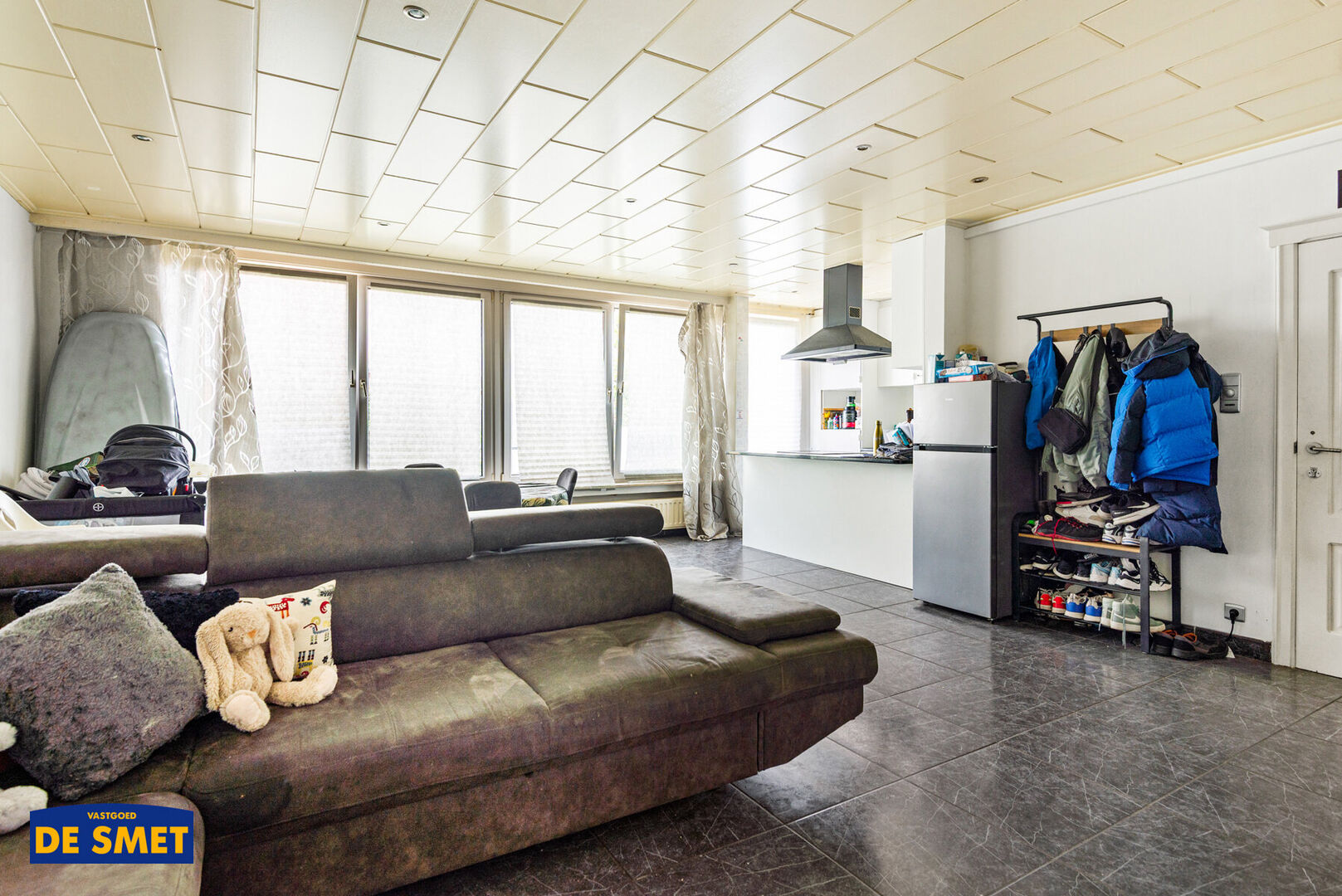 U komt rechtstreeks in de woonkamer met vooraan de open ingerichte keuken met toestellen.