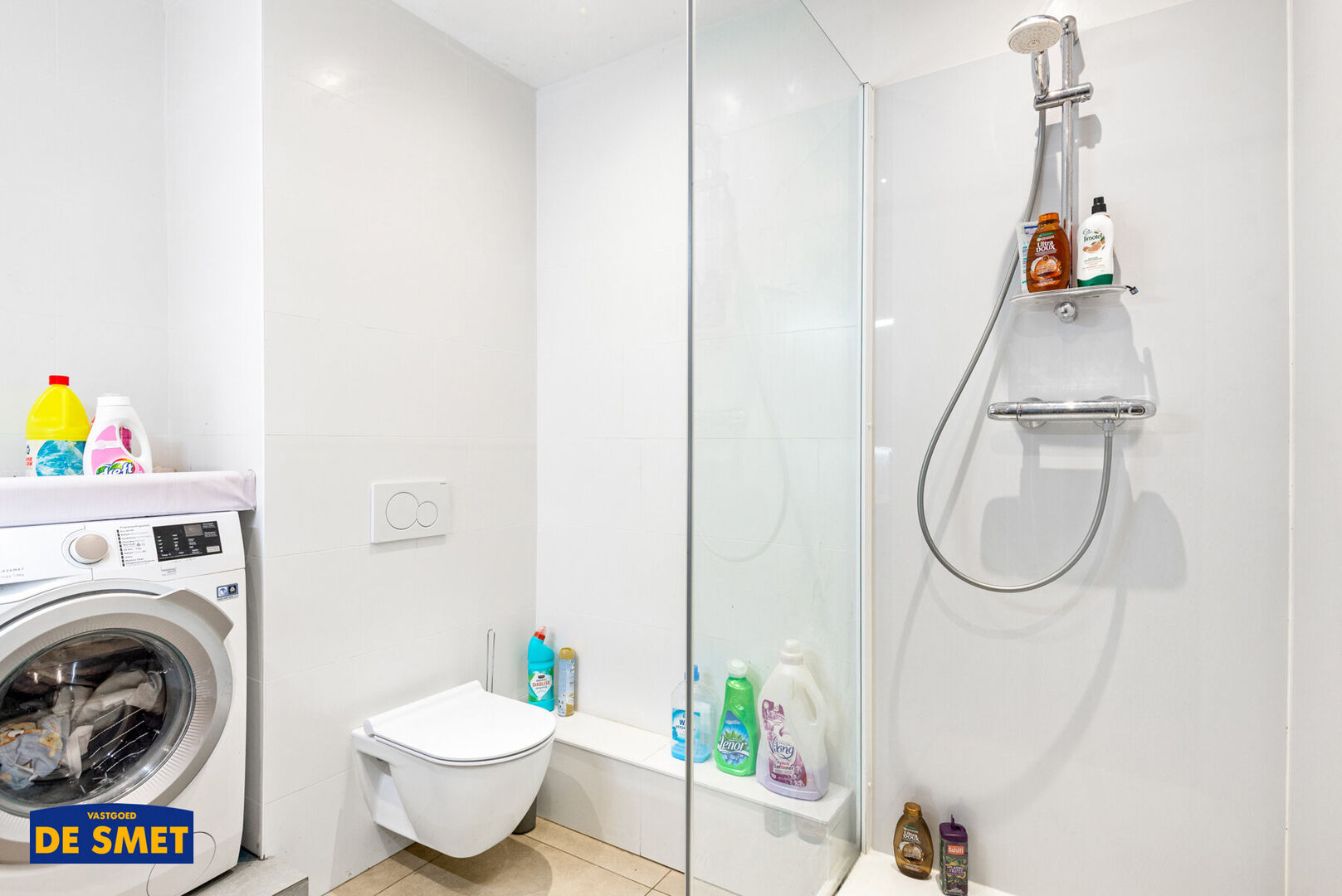 De badkamer is ingericht met douche, lavabomeubel, toilet en aansluiting wasmachine.