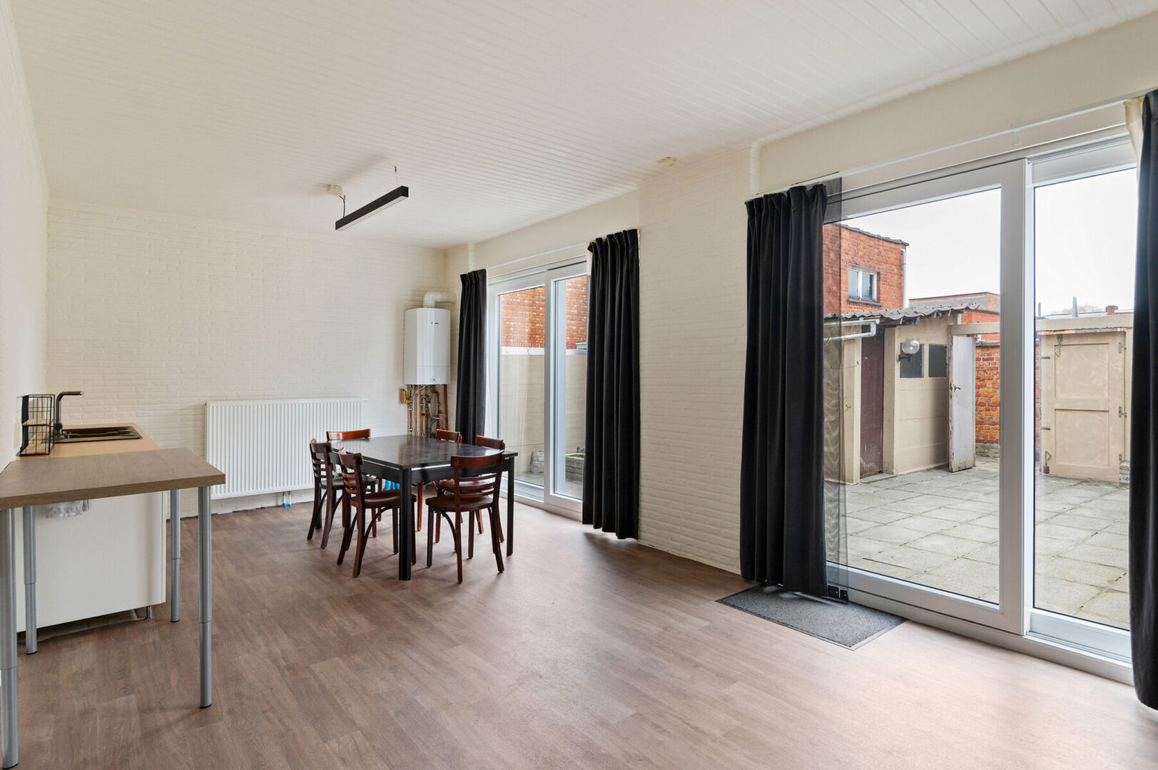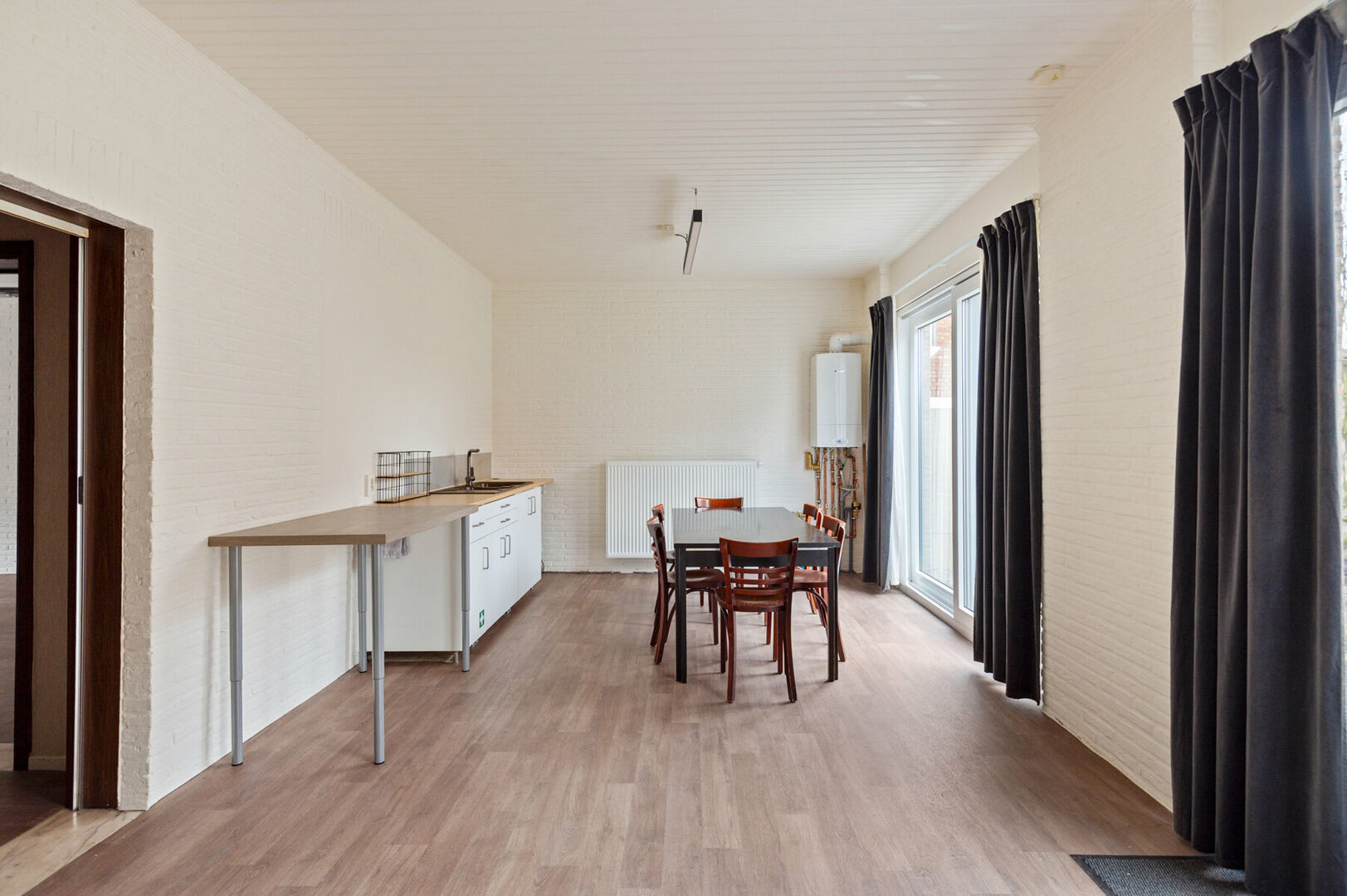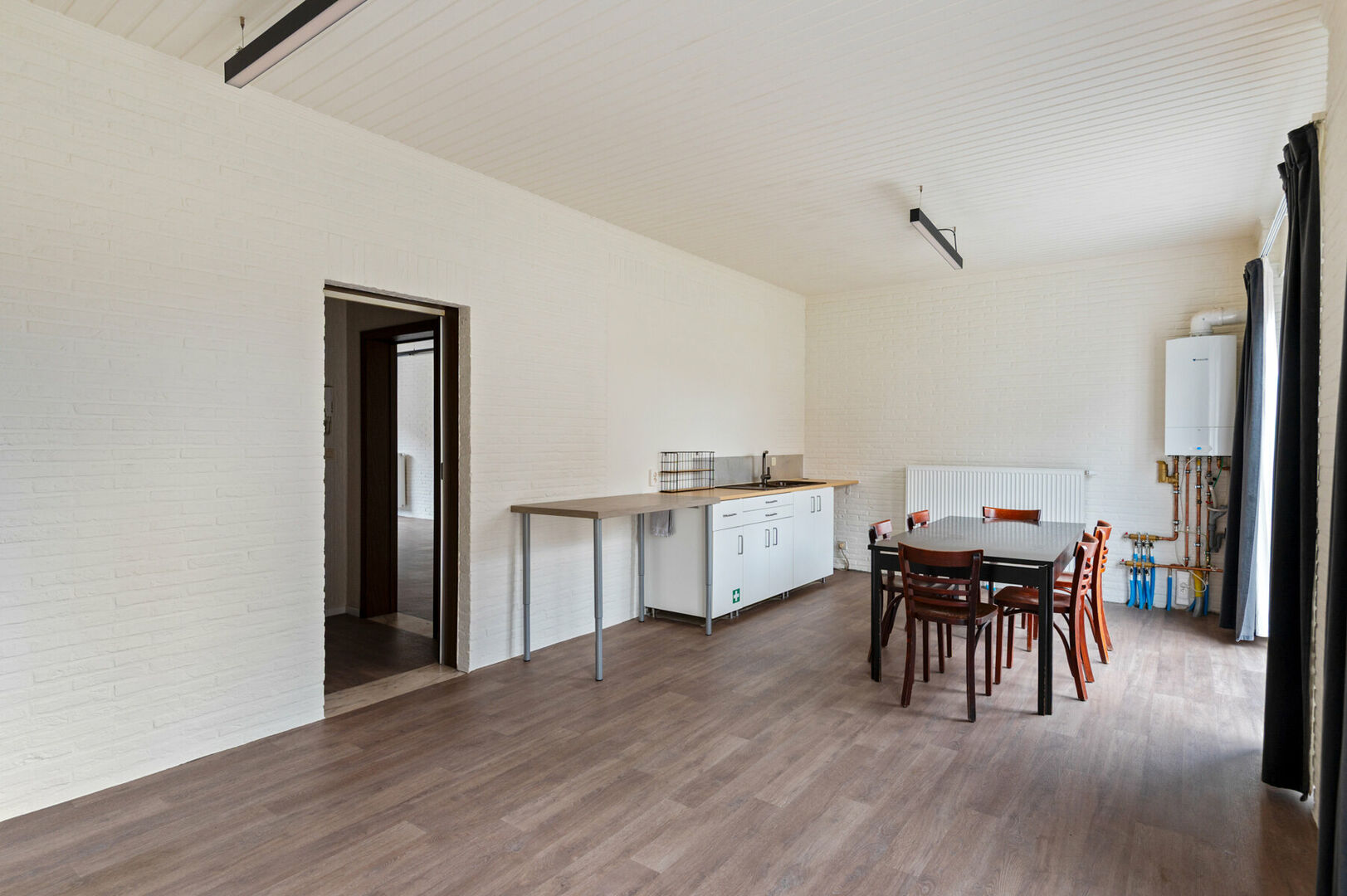 Achteraan bevindt zich momenteel de eetruimte met een recent vernieuwde condenserende gasketel, die nog kan dienst doen als extra bureelruimte.
