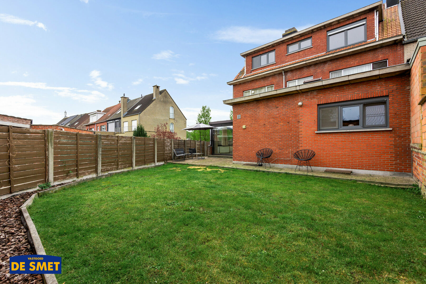 De veranda grenst aan de omheinde tuin met terras en een aparte zij-ingang.