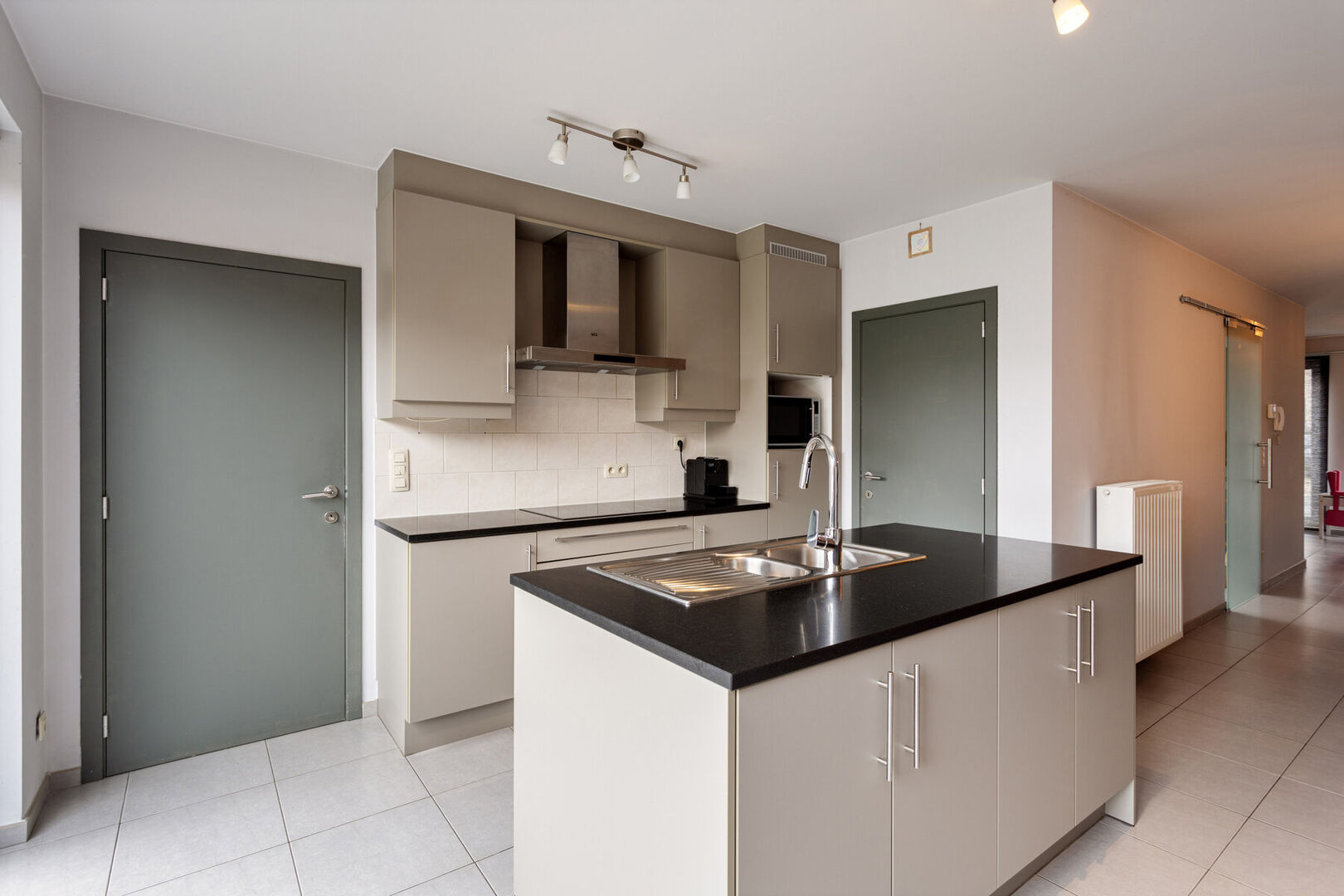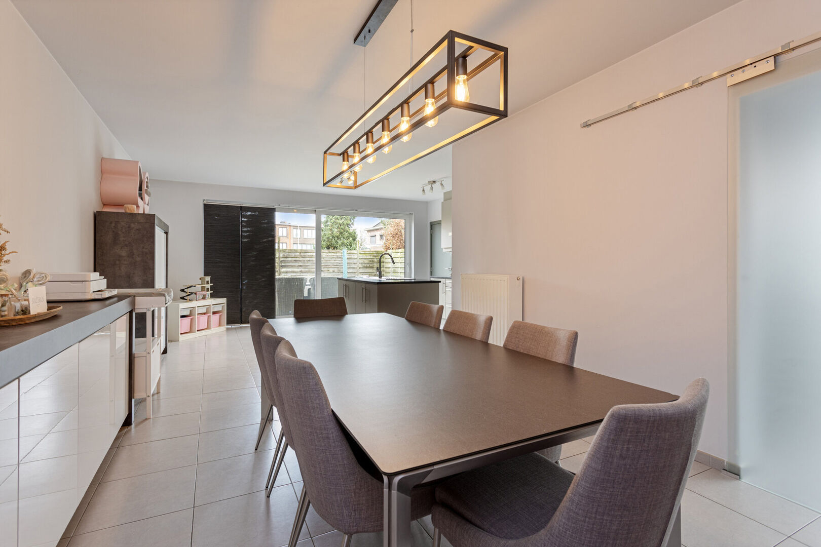 Via de inkomhal met apart toilet komt u in de zéér ruime leefruimte met de open ingerichte keuken met toestellen en de eetruimte achteraan.