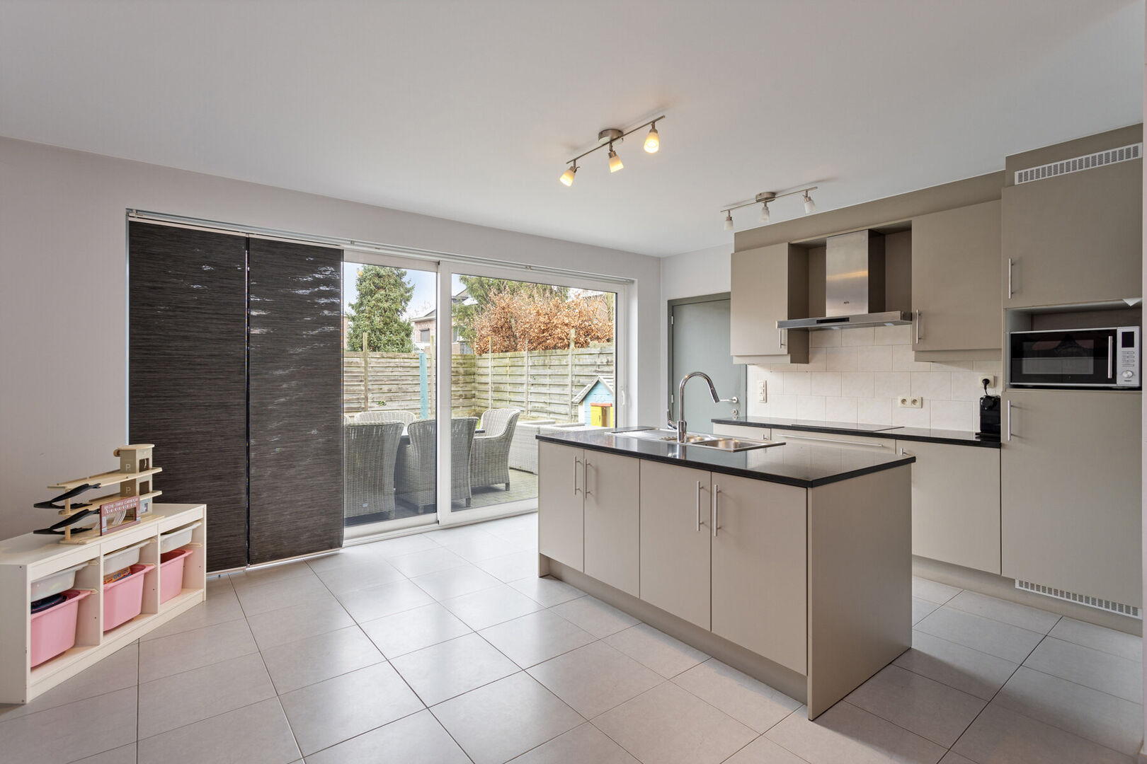 De omheinde noordtuin heeft een terras over de ganse breedte.