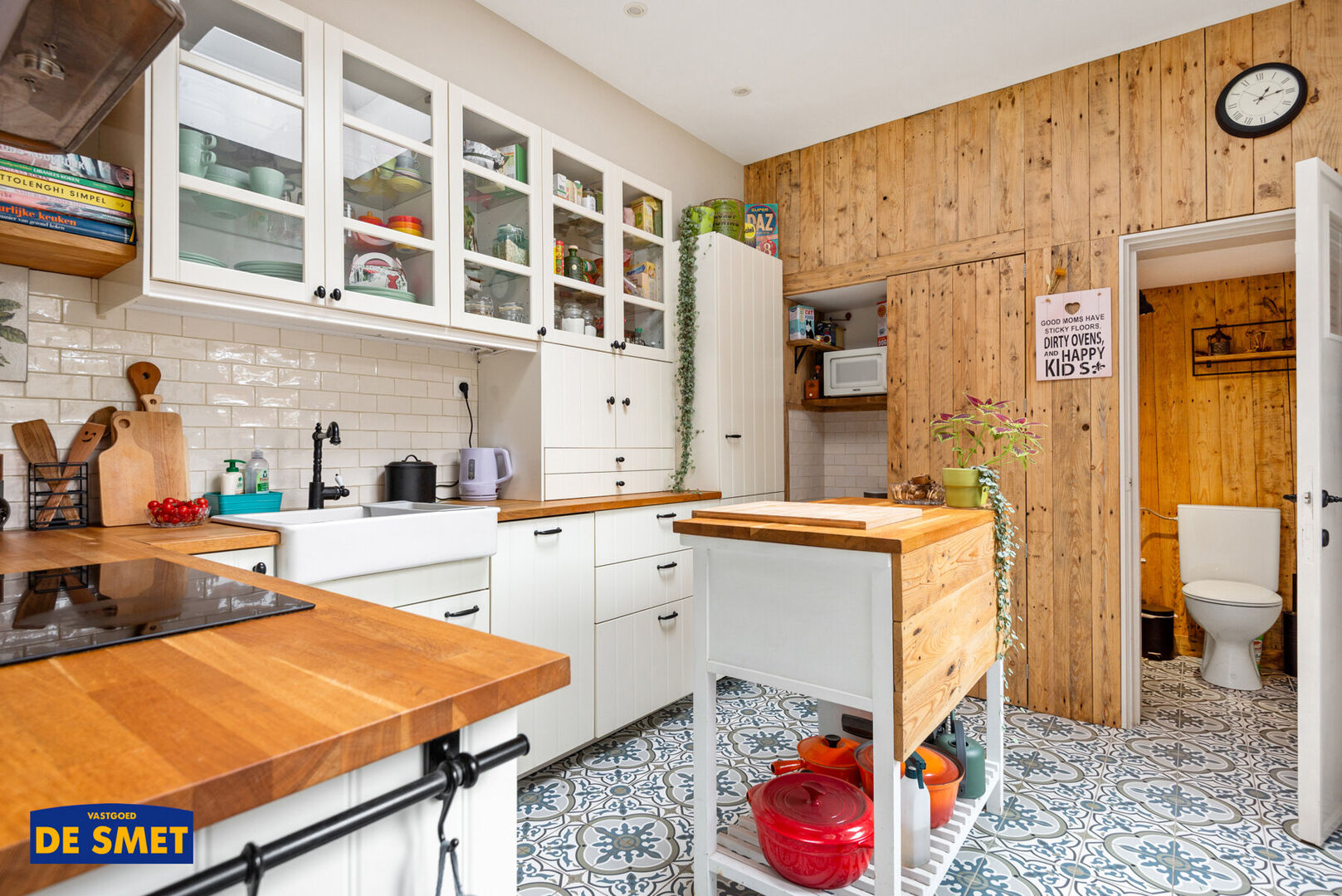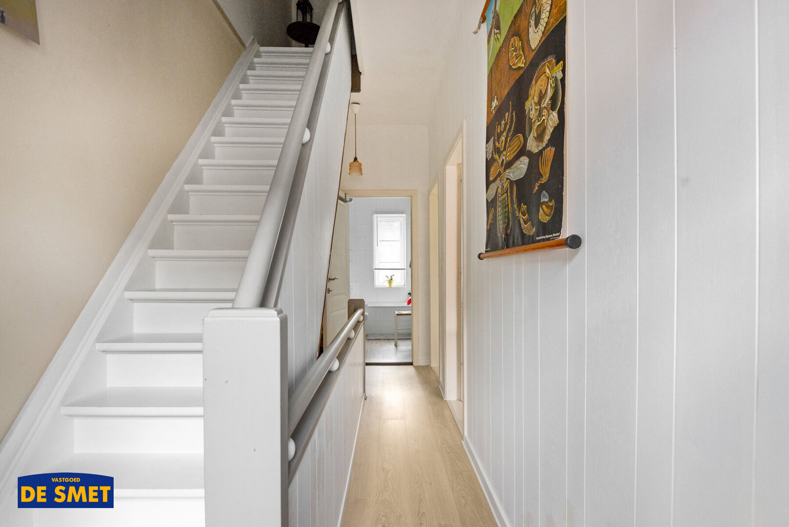 Via de inkomhal komt u terecht in de leefruimte met achteraan de ingerichte open keuken en een apart toilet met aanpalend de wasplaats.