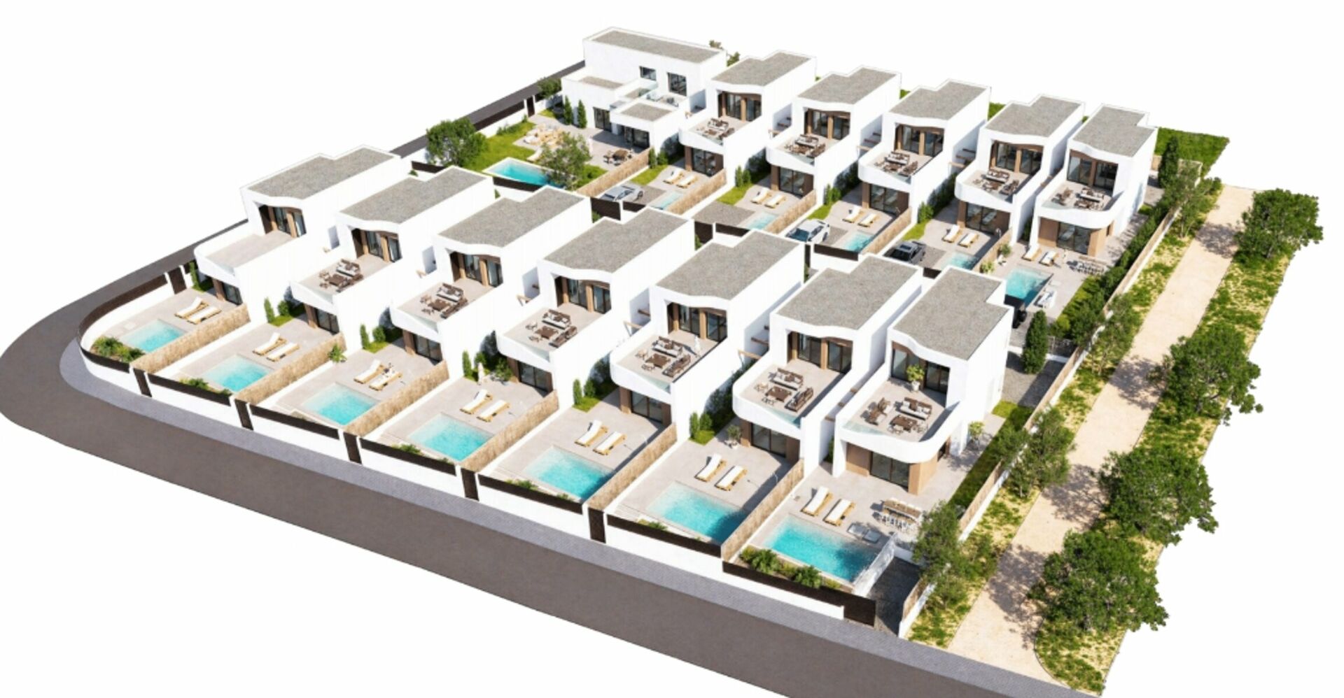 Elke villa beschikt over een privéperceel met zwembad en ruime terrassen, wat de perfecte setting creëert om het hele jaar door buiten te leven.